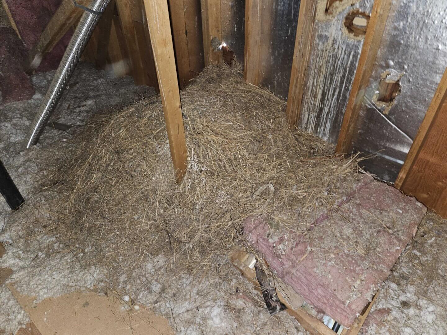 Every now and then during a home inspection, we come across some eyebrow raising items, in this case birds in the attic. These guys were hard at work, likely attempting to build a nest under the very edge of the roof vent which seemed like a good idea at the time. Unfortunately, this roof vent was missing a screen to keep birds and animals out, so their efforts to build a nest up at the roof around the vent resulted in all the nest material dropping into the attic space. We can imagine this bird working diligently to deliver nest material and never seeming to make any progress at all.