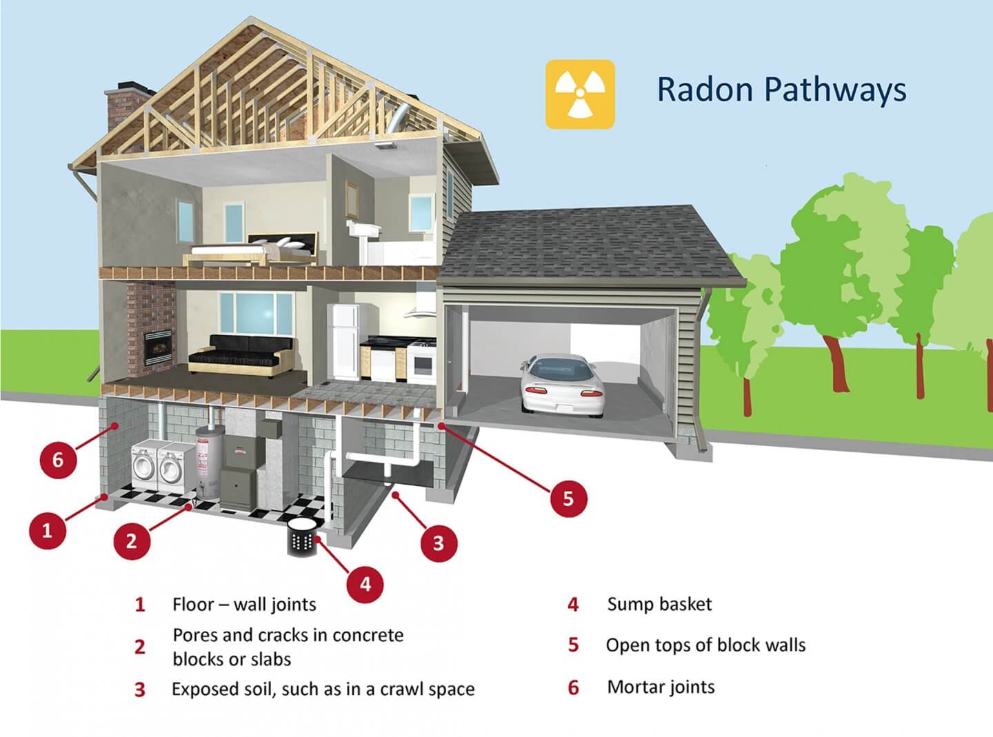 Radon can make its way into homes through foundation cracks, plumbing penetrations, construction joints, sump pits, spaces between basement walls and the slab, and crawlspaces, just to name a few.