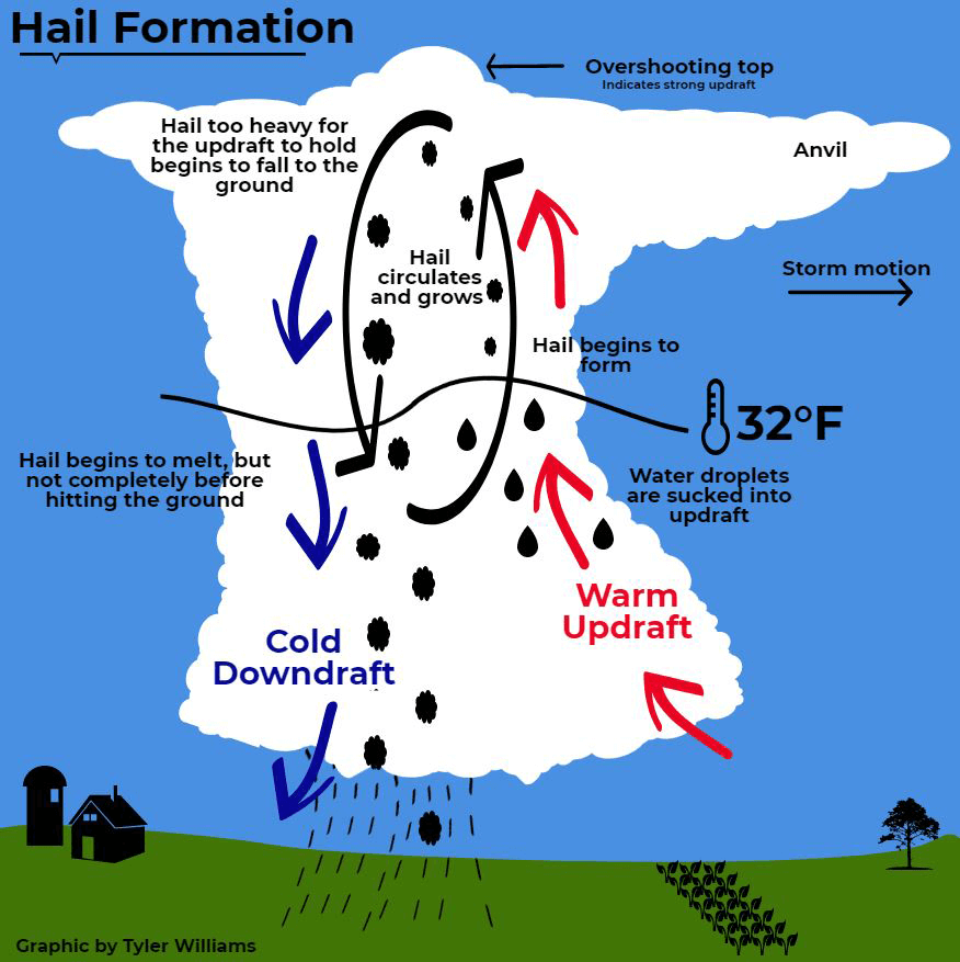 The stronger the wind, the longer this cycle continues, which thus creates larger hailstones. Once the hailstones are too strong for the updraft to keep pushing back up, then the hail rains down to the earth.