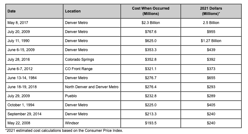 The chart shown above is from the Rocky Mountain Insurance Information Association (RMIIA). It displays the top most costly storms in Colorado history. As you can see, the most damage generally occurs in the Denver Metro area. This makes sense because there are naturally going to be more buildings, homes, businesses, automobiles etc. in an urban area.