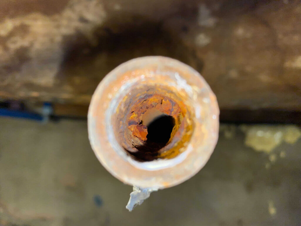While we see this issue at home inspections often, it is less common to see an actual leak because the pipe tends to rust the leak closed.