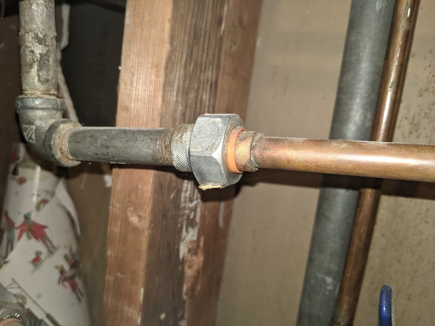 When a copper pipe is directly connected to a galvanized pipe, the small electric current that that water carries begins to decompose the pipes. This is called “galvanic corrosion” and it is caused by electric current moving along the two different pipe materials.