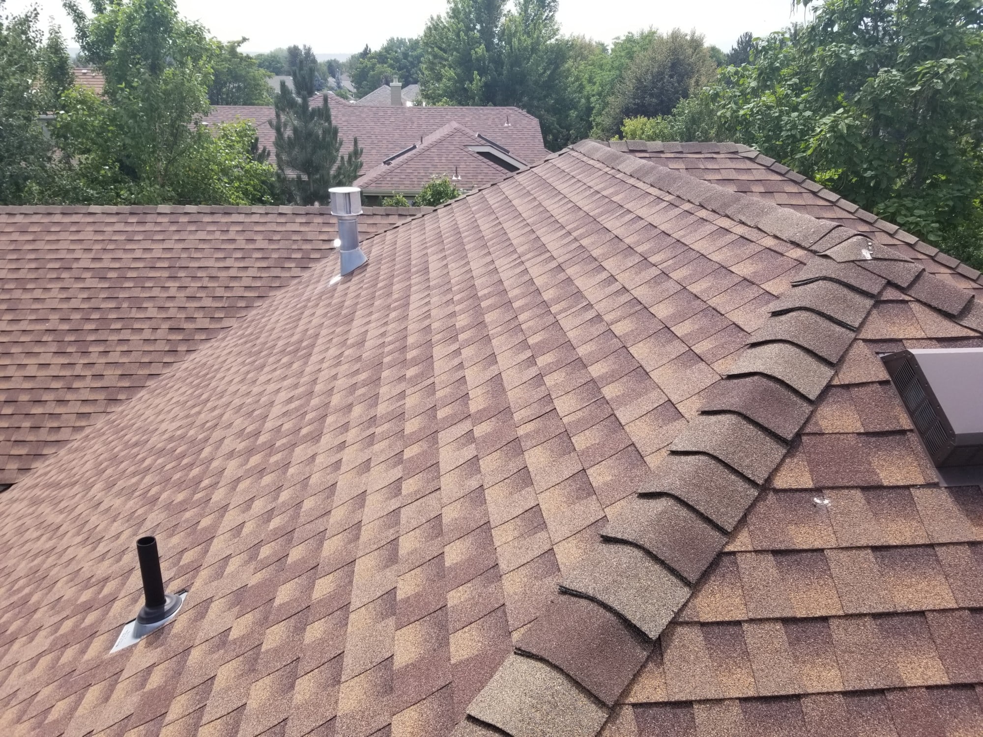 At roof edges, we install drip edge flashing under the shingles. This provides a simple capillary break, so that the water can drip off of the bottom of the metal flashing material rather than wicking up under the shingles and causing potential damage to the roof decking and eaves.