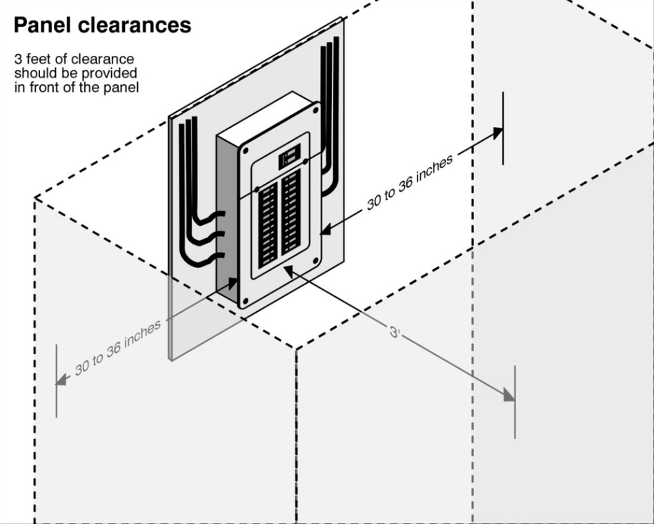 There should be at least 36 inches of clearance in front of the box, and 30-36 inches to its left and right. Additionally, nothing should be propped against it or stacked on top of it.