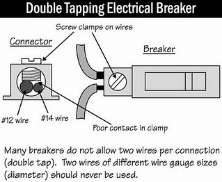 A common defect we see is double tapping – where two or more conductors are connected to one breaker (shown below). This is not allowed, and should be corrected for safety. An electrician should evaluate and repair this item.