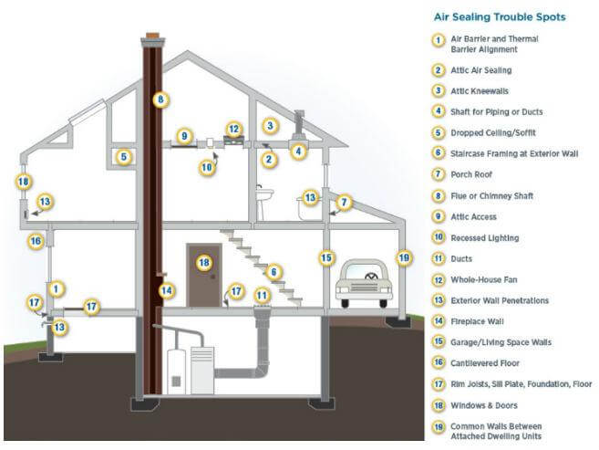 There are a number of common points where air leakage can take place in the home. Windows, doors, recessed lighting fixtures, exterior wall penetrations, ducts, fireplace walls are a few examples of trouble areas (see more examples in the image below).