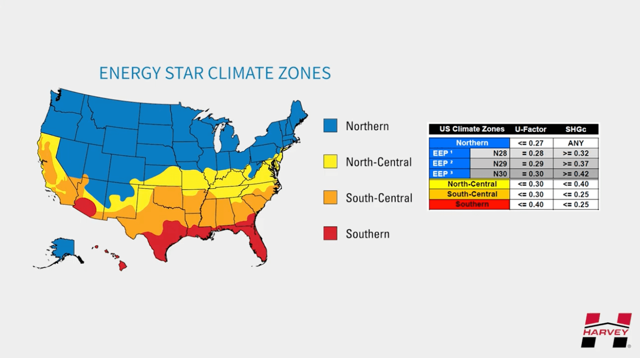 Homes in northern regions (shown in blue) have several options that qualify for Energy Star certification. With each option, as the U-Factor increases, so does the Solar Heat Gain Coefficient. This essentially means that the heat gain caused by the sun must compensate for the heat loss from a window with a higher U-Factor. It is the tradeoff between these two measurements that helps to create the overall performance of a window.