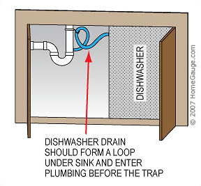 Dishwashers – The inspector will run the appliance on a short cycle, when possible. If there is any evidence of damage, rust, loose fixtures etc. it will surely be noted on the report. We always pay close attention for any apparent leaking during the cycle. In addition, the dishwasher discharge hose should also be looped and elevated above the disposal entry point (as shown below) to prevent liquid and debris from dumping back into the dishwasher.