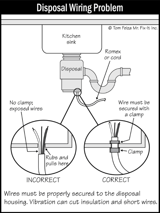 Garbage Disposal – This one is fairly straight forward. We will make sure the garbage disposal turns on and operates properly without any damage or leaks. One important thing to check for is the proper bushing, or clamp, for the electrical wiring. This is important because it protects the electrical cord from damage caused by vibration, sharp edges, and movement.