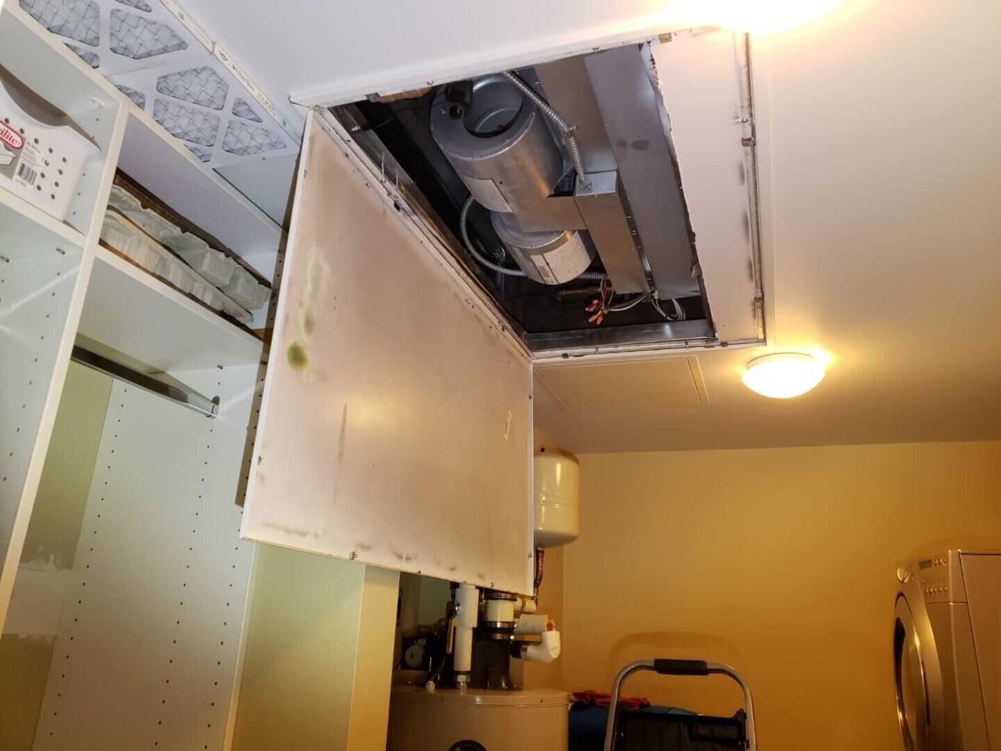 First, they will visually inspect all accessible components of the system. Of course, there are many parts hidden behind the drywall. And inspecting a large heating unit that services a whole building is out of the scope of our standard inspection. However, we can usually gain access to the air handler, which can likely be found in the bathroom or hallway ceiling (as shown below), or in a utility closet. The inspector will look for any noticeable defects or damage, and report as necessary.