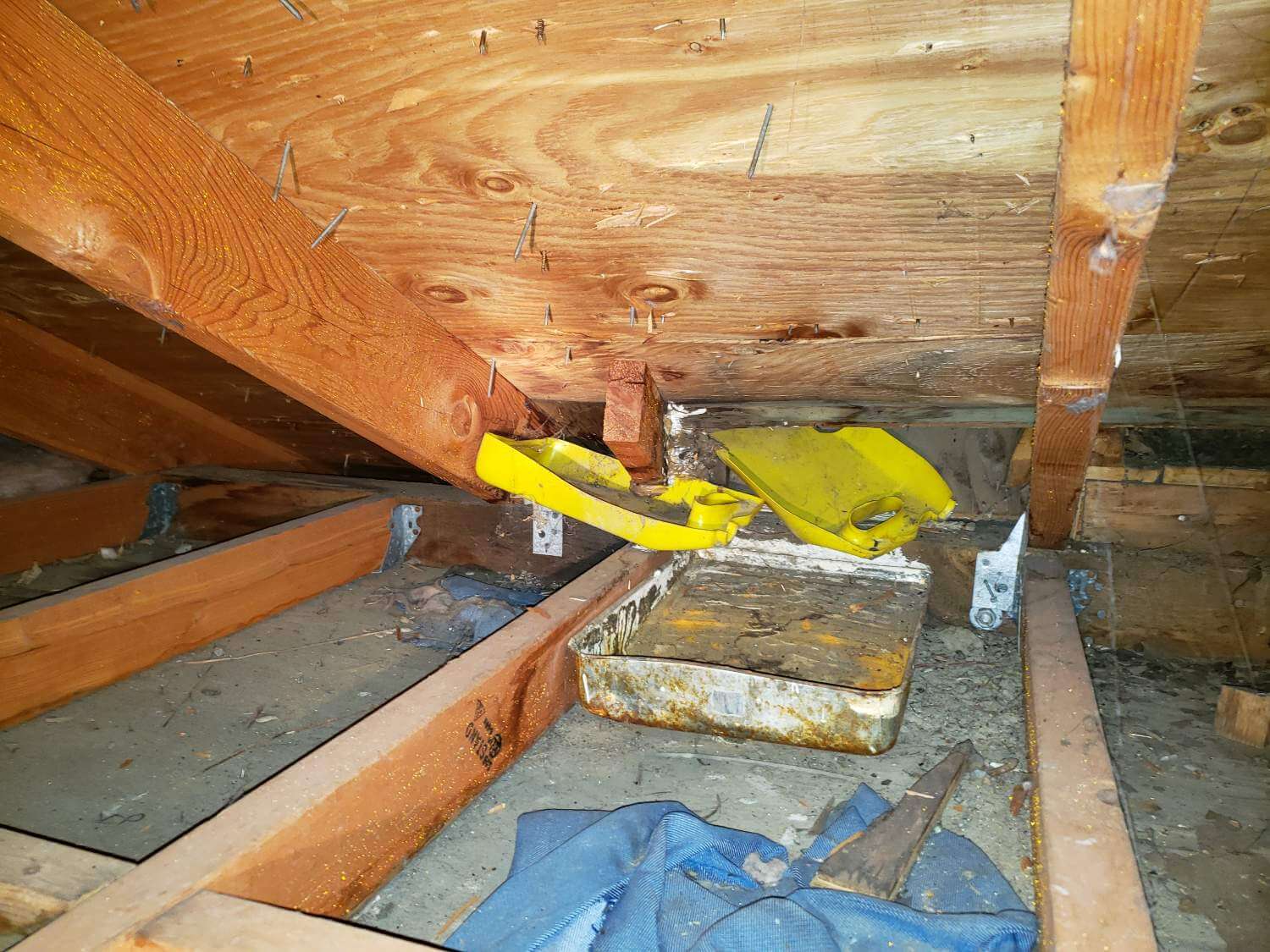 The lengths people go to avoid fixing the root problem never ceases to amaze. These paint trays were all shoved in place to catch water from a roof leak.