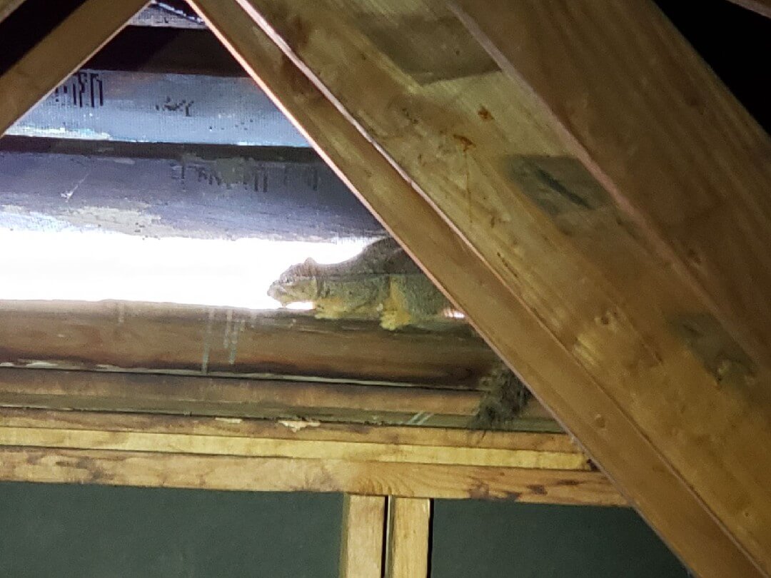 Looks like the attic of this home may need a replacement screen to keep the animals out, but this squirrel has found a comfortable spot to hang out for now.