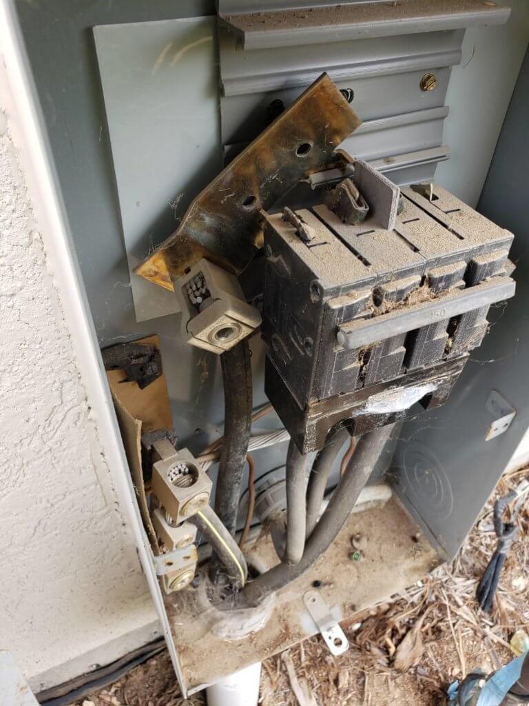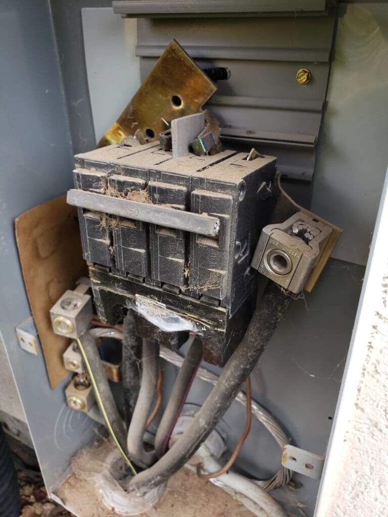 Take a look at this main breaker. The bus bar that provides power to the breaker has completely fallen apart! The bronze, metal piece with the larger cables connecting to it is live electricity. Definitely not safe! This called for immediate repair.