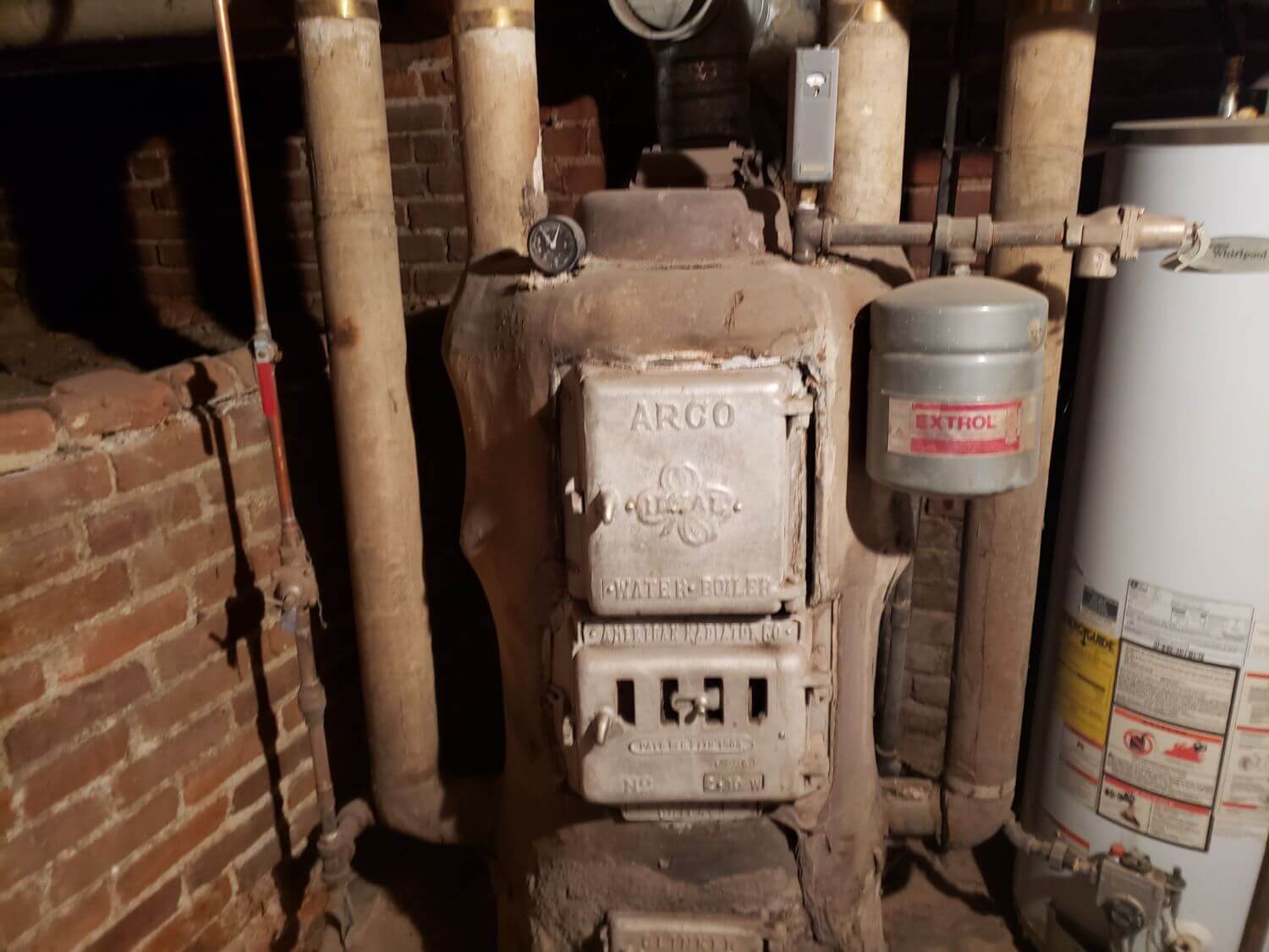 A very, very, very old converted gravity furnace is still in use today in this home. Not only is this thing older than most everyone reading this blog, but it’s also fully wrapped in asbestos tape!