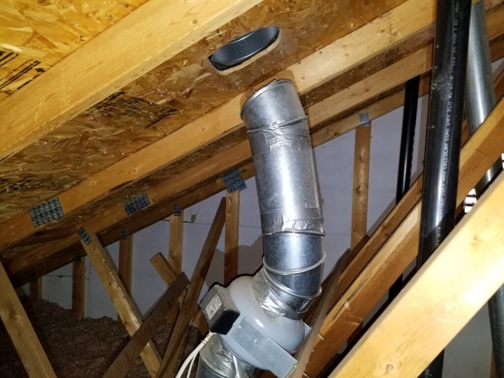This vent fan is venting from the crawlspace up into the attic. Looks like it was connected to the roof vent, but has since become detached. Now the moisture is just venting from one crawlspace to another!