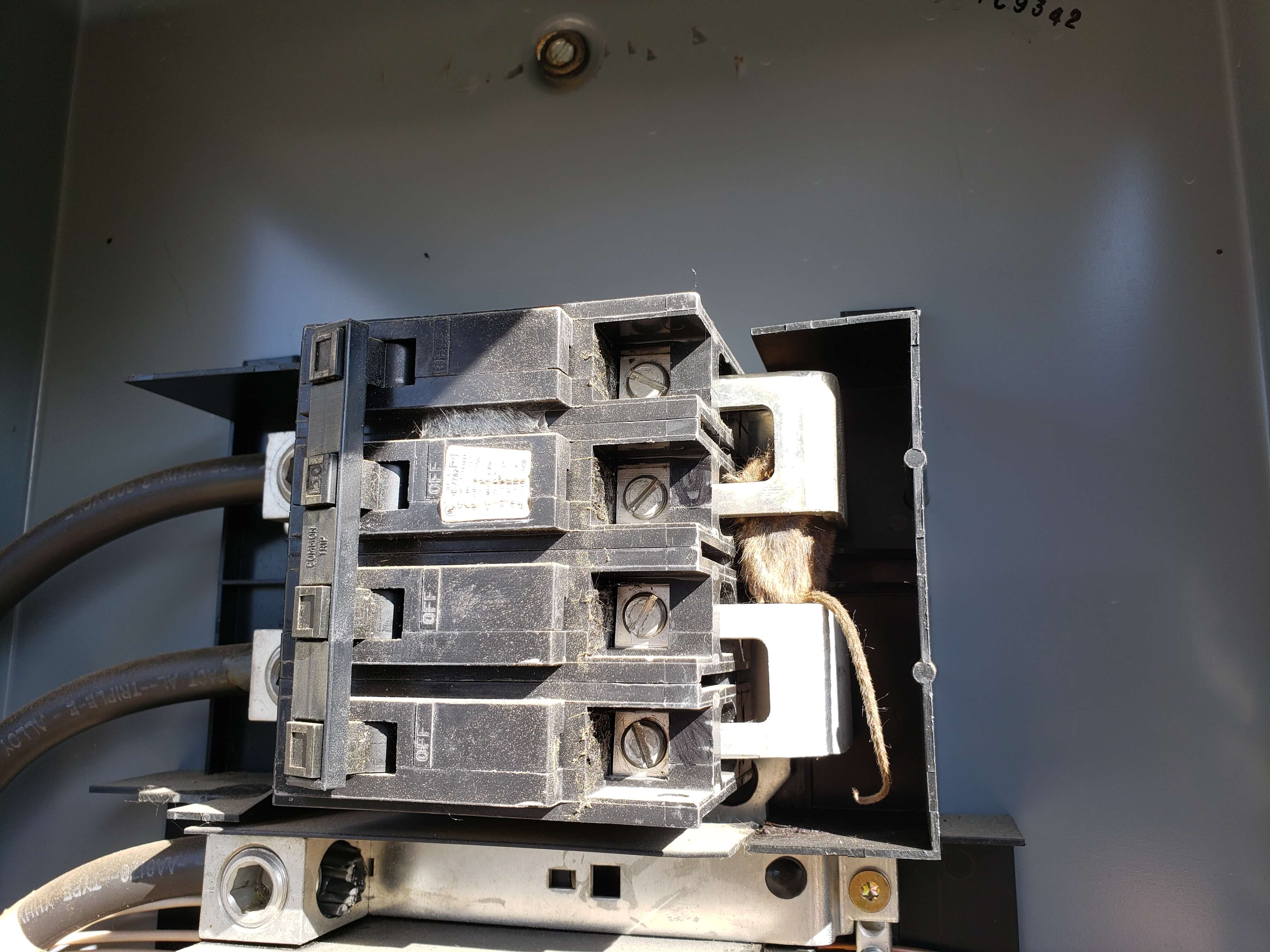 Ouch. What a way to go out. 150 amps of bZzzzzzZzz. The mouse will definitely need to be removed from the main breaker of this panel before any issues arise. However, looks like the mouse has some issues of his own.