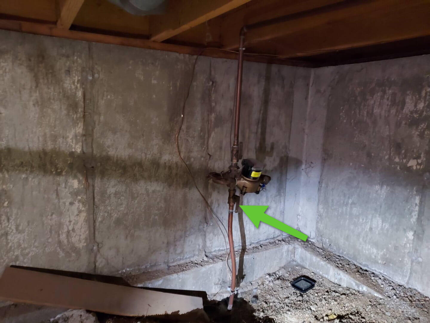 If this is a crawlspace, then enter the crawlspace and scan the side of the home that was determined in the previous step. You will be looking for a larger metal pipe coming out of the ground with a shut-off handle close by. Congrats! You found your shut-off. These older shut-off points in crawlspaces are not very convenient, so there may be a secondary shut-off farther down the line. We recommend you follow the pipe to find the first place it enters the livable space and check the other side of the floor/wall.