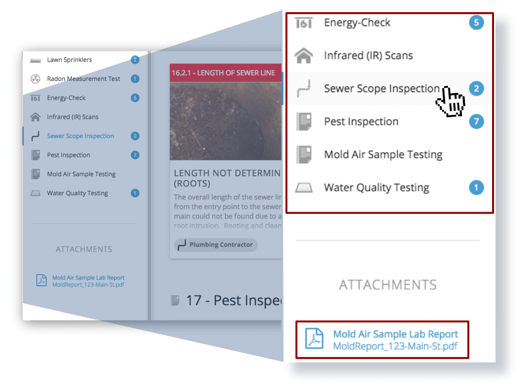 All your add-on inspections are included in the same report. No more shuffling through multiple PDFs and documents. Whether you ordered a sewer scope, radon test, pest inspection, or a water quality test, you can find them all on the left navigation bar.