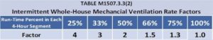 TABLE M1507.3.3(2) INTERMITTENT WHOLE-HOUSE MECHANICAL VENTILATION RATE FACTORS