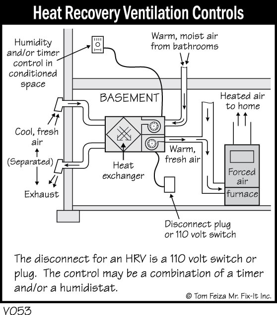 - Heat Recovery Ventilation Unit (HRV): this is a whole house ventilation unit that connects to the ducting system of the home and is typically installed in the mechanical room near the furnace. Two penetrations are needed to the exterior, one for supply air and one for exhaust air. Two penetrations are also made into the ducting system, one on the supply side to inject fresh air and one on the return side to exhaust stale air. A filter box is present within the unit to mix the air and recover heat from the duct system to minimize injection of cold air into the home. Maintenance of the unit is needed to clean the filter system.