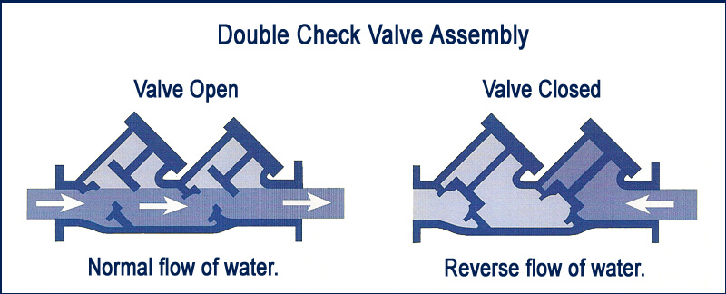 This diagram illustrates the double check style valve BFP, generally used on larger irrigation systems. Image sourced from: https://bethpagewater.com