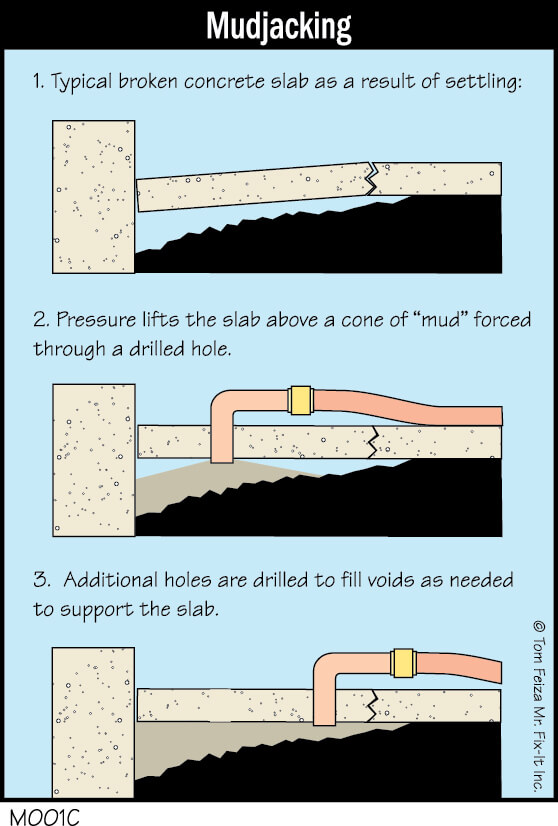 If there are many cracks present, or the concrete itself is chipping-damaged, mud jacking won’t be possible and the damaged floor must be completely removed and a new one must be poured.