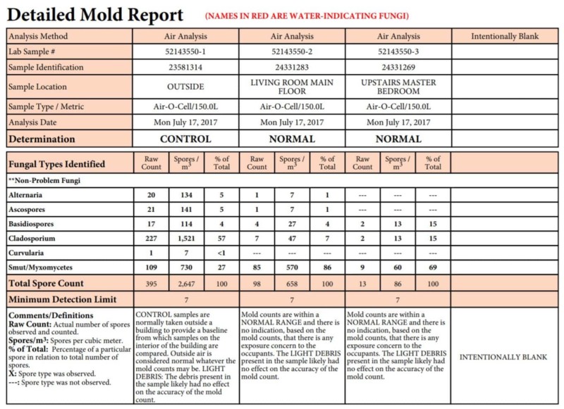 Once the mold air samples are taken, each cartridge is sealed and the samples are shipped overnight to a lab. The lab analyzes each cartridge and prepares a report outlining the mold spore types present and the count of mold spore types for each sample. A written report is prepared showing the breakdown of mold counts per type. The lab will make a determination on whether the counts present are within a normal or elevated/problem range. If results come back in an elevated or problem state, it means the mold spore counts as compared to the outside reference sample are elevated to a point where exposure could represent a concern to occupants. Based upon the results, action can be taken to investigate that specific area of the home further to try to determine where a moisture or water concern may be present.