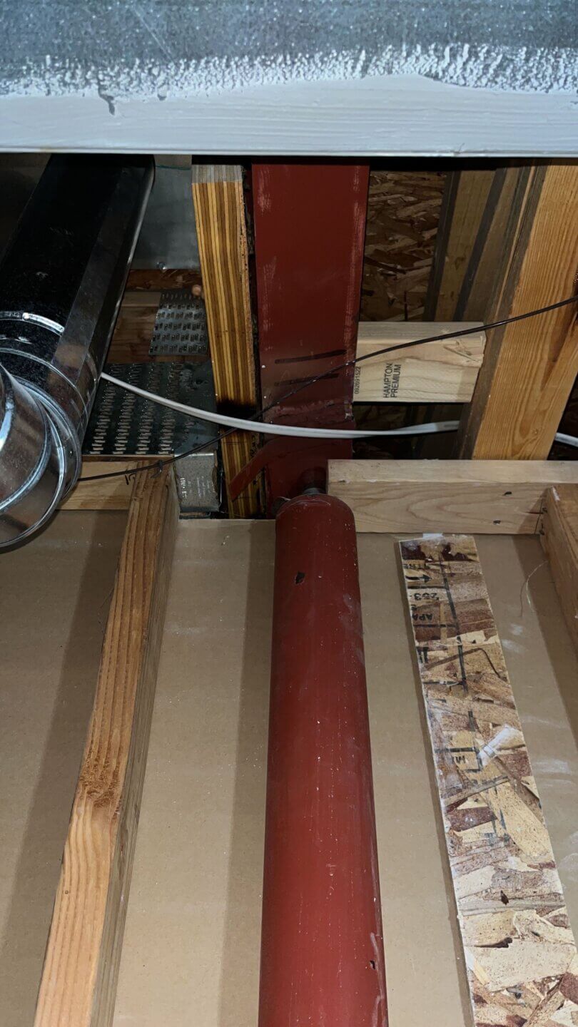 Posts (or columns) are the vertical components of the structure that work with the foundation to transfer the load of the building into the ground. So needless to say, these should be in good condition! The inspector will be on the look out for any damage, settling, deterioration, rust, and even makeshift posts that might have questionable strength or integrity. The photo above shows an example of a makeshift post (indicated by the red arrow) that will definitely be called out for further evaluation.